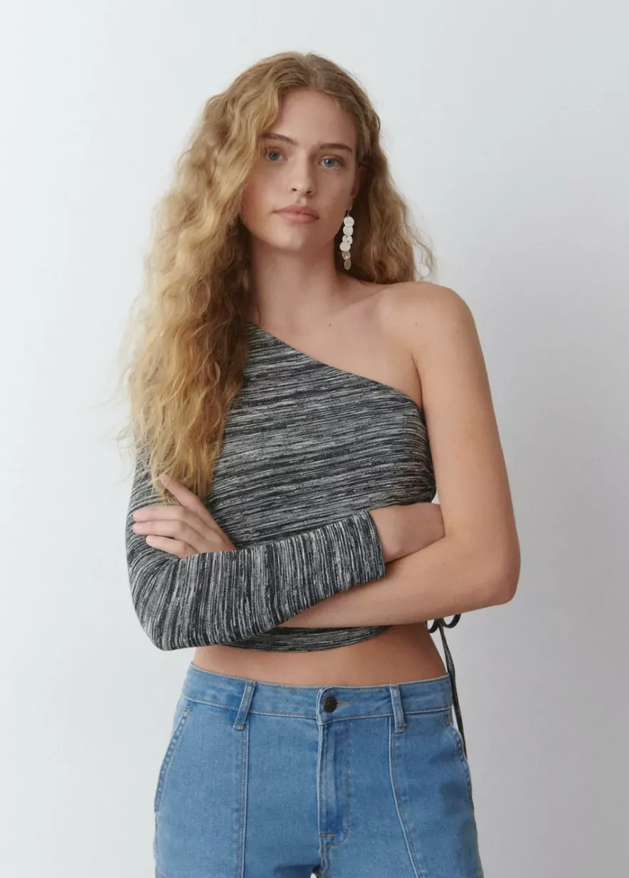 Camiseta De Rayas Asimetrica Con Una Manga Larga Y Fruncido En El Lateral Mediante Lazada.Composicion: