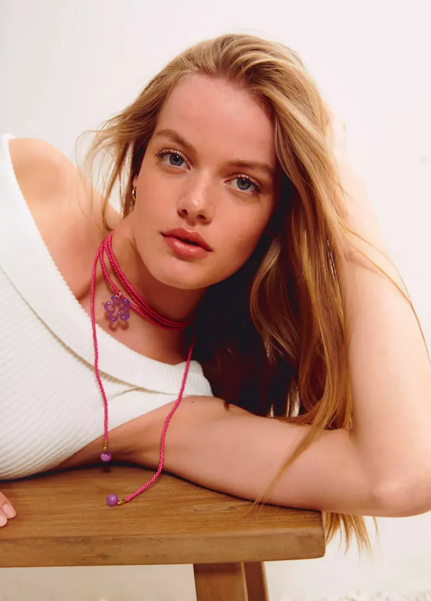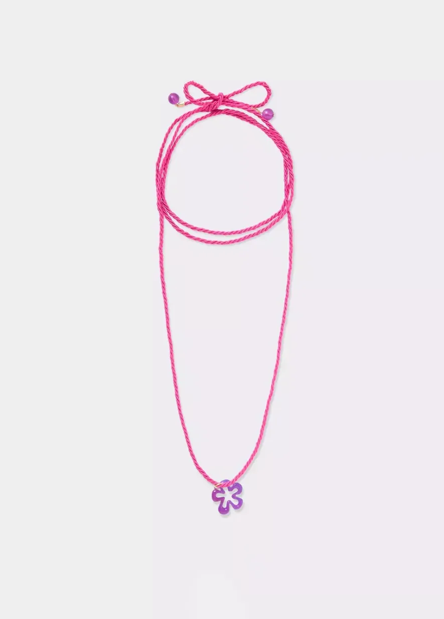Collar De Algodon Largo Con Detalle De Flor De Resina Fucsia.Composicion: