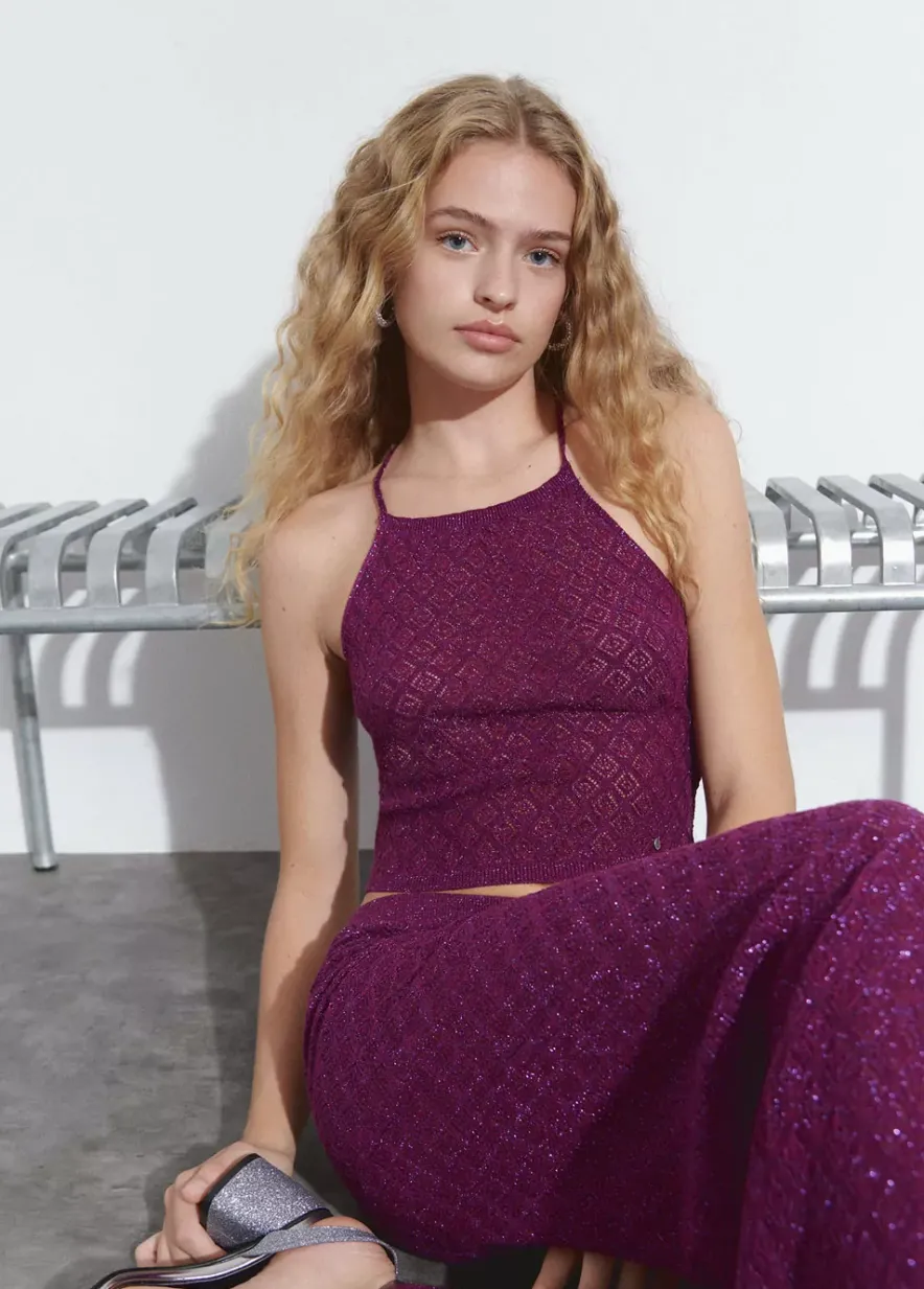 Top De Punto De Hilo Metalizado Con Cuello Halter Y Espalda Cruzada.Composicion: