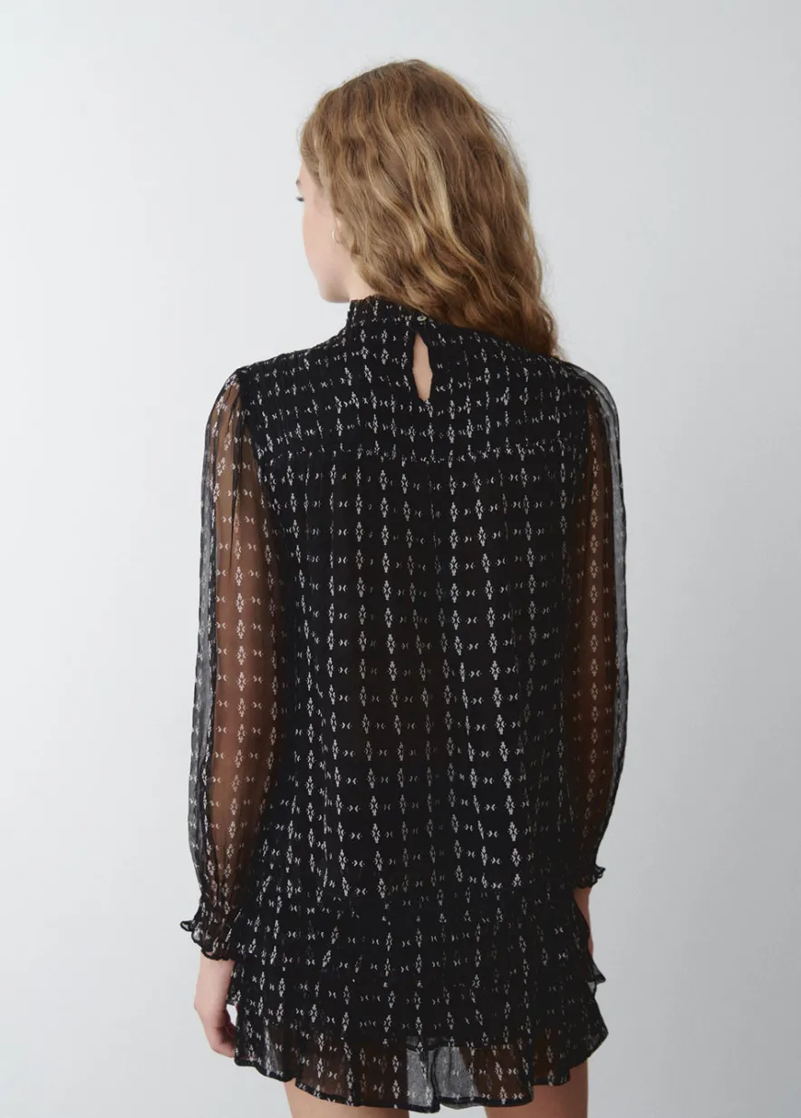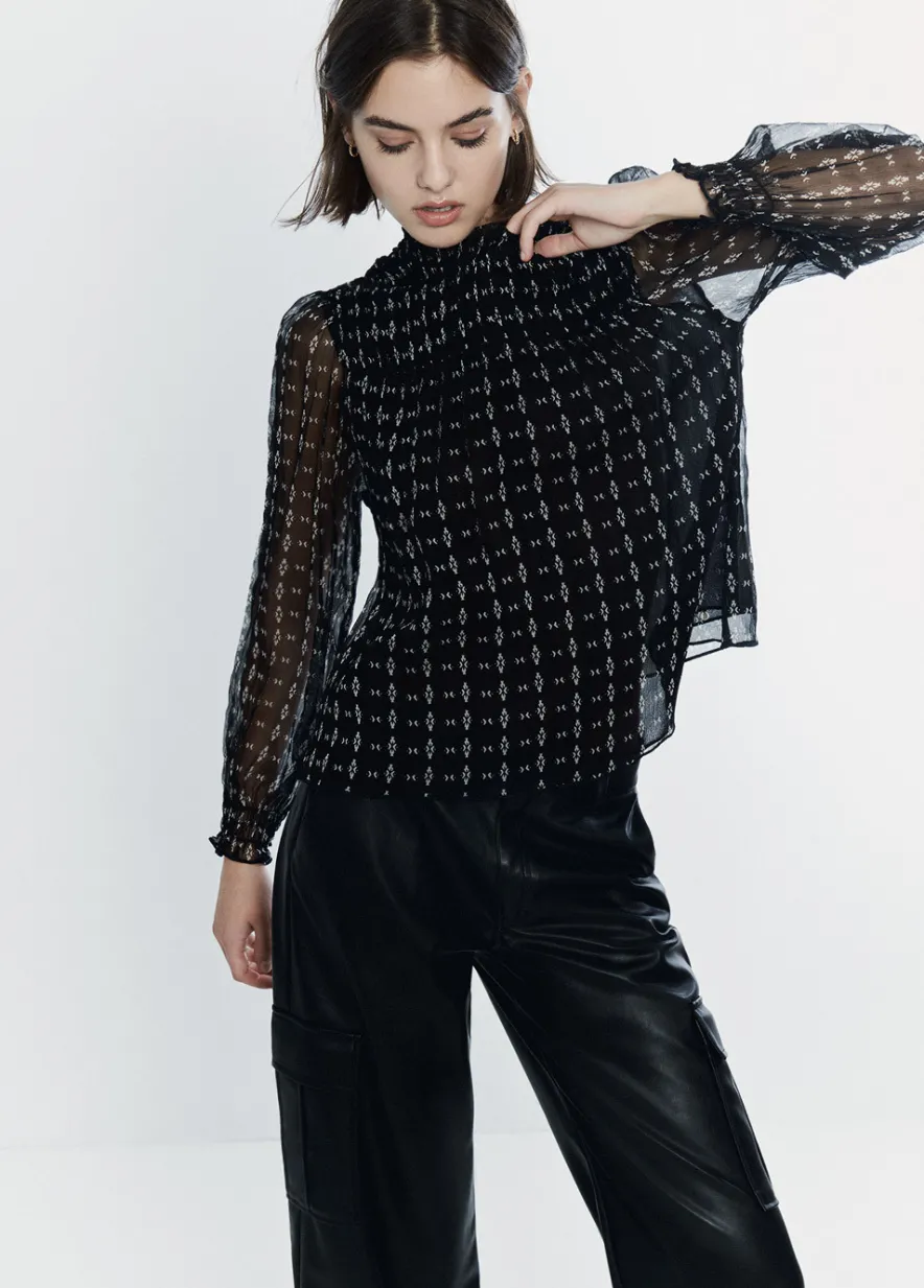 Blusa Estampada De Manga Larga Semitransparente Abullonada Y Cuello Alto Con Smock En La Parte Superior.Composicion: