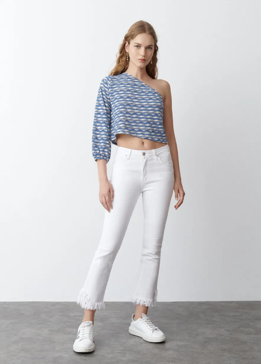 Camiseta Asimetrica Estampada Con Una Manga Larga Abullonada.Composicion: