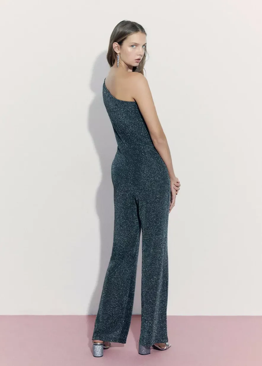 Mono Largo Asimetrico De Hilo Metalizado Con Una Manga Larga, Apertura En El Hombro Y Pantalon De Campana.Composicion: